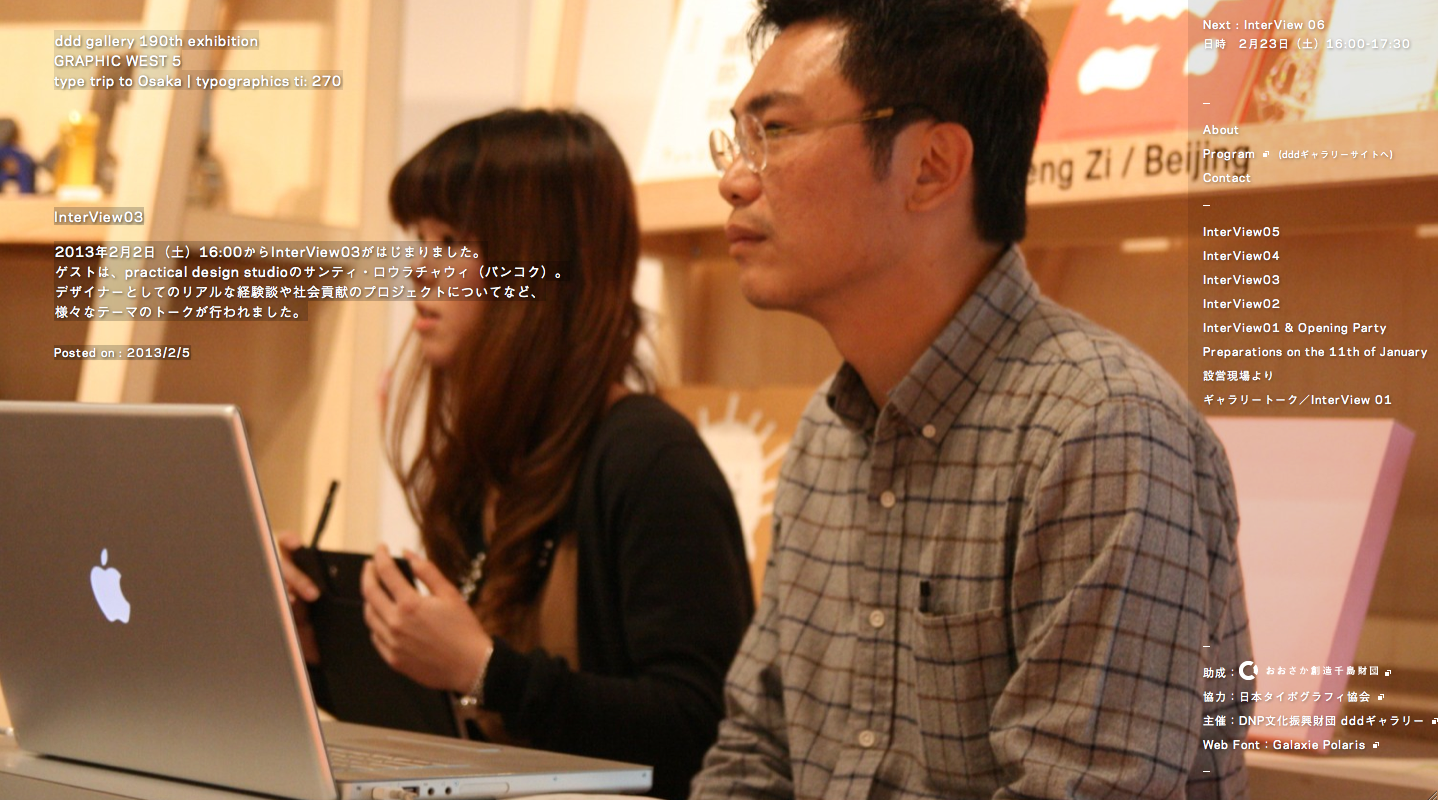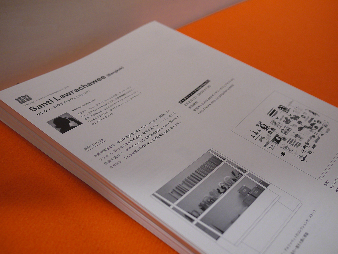 “Typographics ti:” Japan Typography Association newsletter has been featuring state-of-the-art graphic design spans Asia for two years from April 2011. Featured with the theme of “type trip” / “Osaka”. Reconfigured gallery space ranging from designer thought process, the exhibition designers and Asian members of the Japanese editing and production, in three dimensions, and the magazine production process and co-produced the “type trip to Osaka” together exhibition. Talk to the venue such as holding interviews the gallery, facing a designer of each city, we will introduce the network and graphic design of the latest situation in Asia.