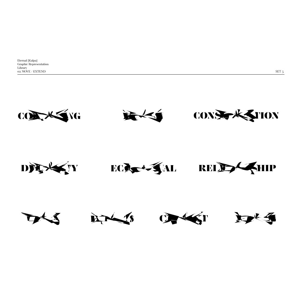 This design process begins with the curation of a source graphic library relevant to the project. This includes unique shapes such as the outline of Phuket Island, the typography of the event title, key terms central to the theme (e.g., “Eternal,” “Kalpa,” “nature,” “humanity,” “coexistence,” etc.), and other important communication markers. These source images are fed into the auto-generative system, where they are processed under the four aforementioned conditions. The automatically generated graphics are then collected and stored in a Graphic Library under the Thailand Biennale 2025 identity system. This allows designers to select and apply various elements (symbols, typography, color palette, and graphic sets) to design diverse media for Thailand Biennale 2025, tailored to different objectives.