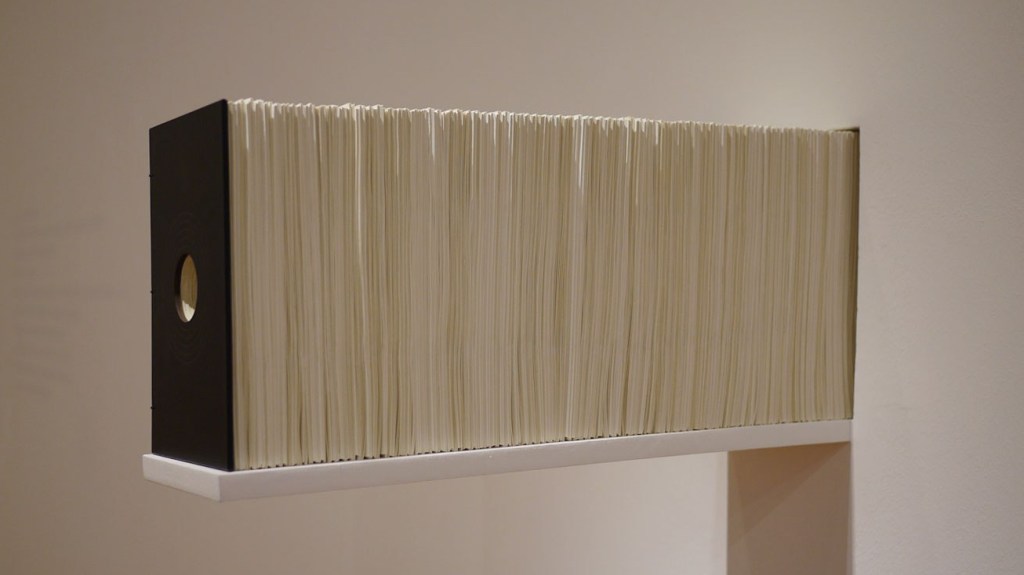 ผมจำลองบรรยากาศส่วนตัวนี้ผ่านหนังสือที่มีความหนาราว 90 ซม. มีรูทะลุตลอดทั้งเล่ม ตั้งแต่หน้าแรกจนถึงหน้าสุดท้าย ติดตั้งในระดับที่ผู้ชมสามารถพูดหรือบอกอะไรกับมัน ด้วยหวังว่ามันคงจะหนาพอ ที่จะแบ่งปันพื้นที่ว่างสำหรับผู้ชมที่อาจต้องการฝากบางสิ่งบางอย่างไว้กับมัน…